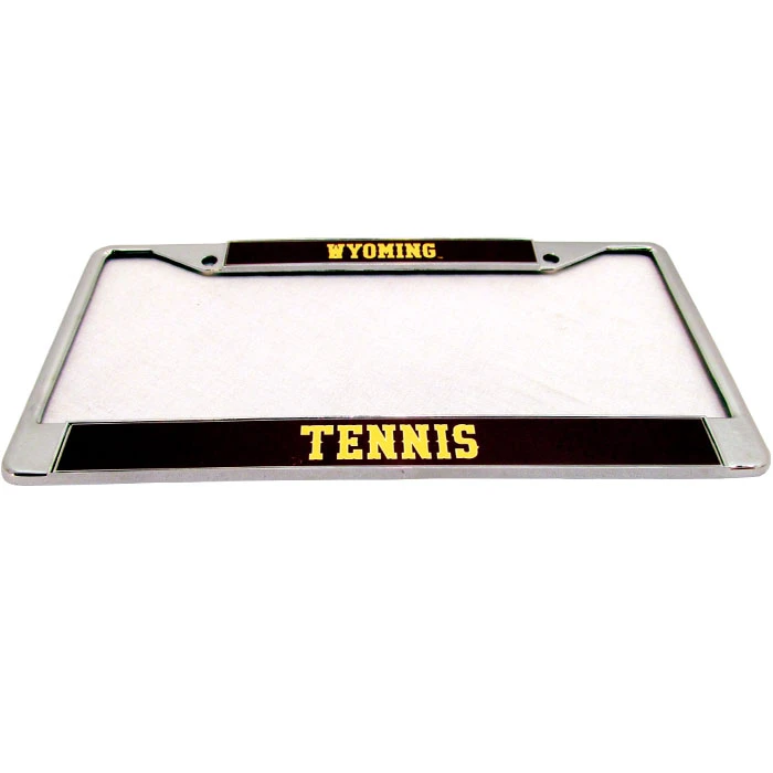 This chrome license plate frame says “Wyoming Tennis” in brown and gold.